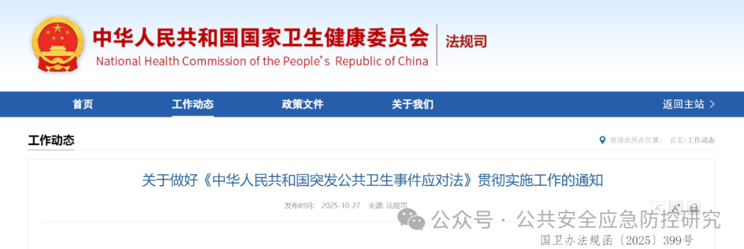 《中华人民共和国突发公共卫生事件应对法》(以下简称《突发公共卫生事件应对法》)已于2025年9月12日经第十四届全国人民代表大会常务委员会第十七次会议审议通过,自2025年11月1日起施行。为做好《突发公共卫生事件应对法》贯彻实施工作,现就有关事项通知如下: